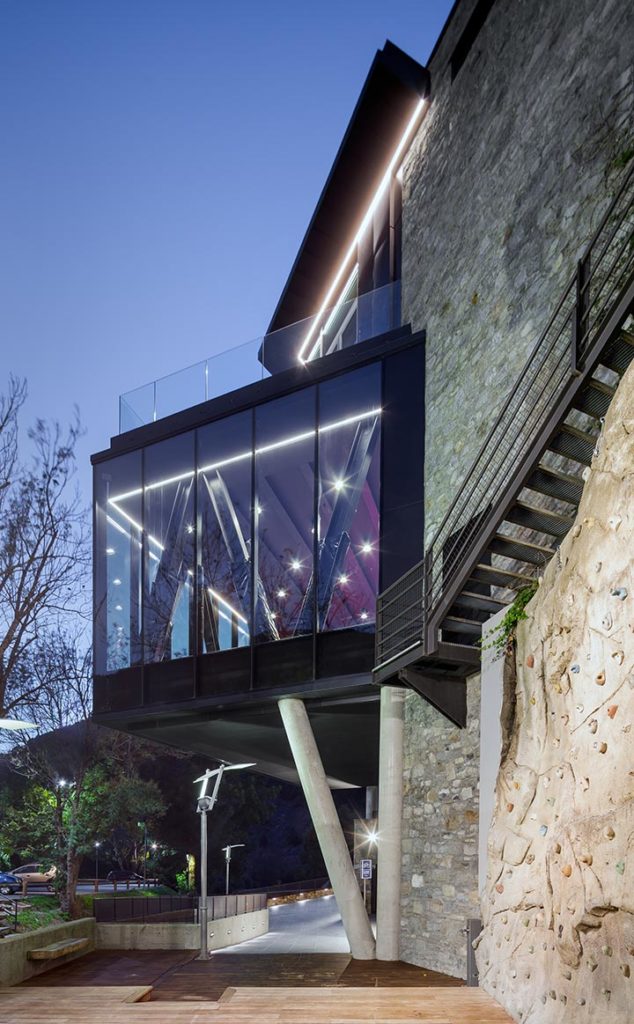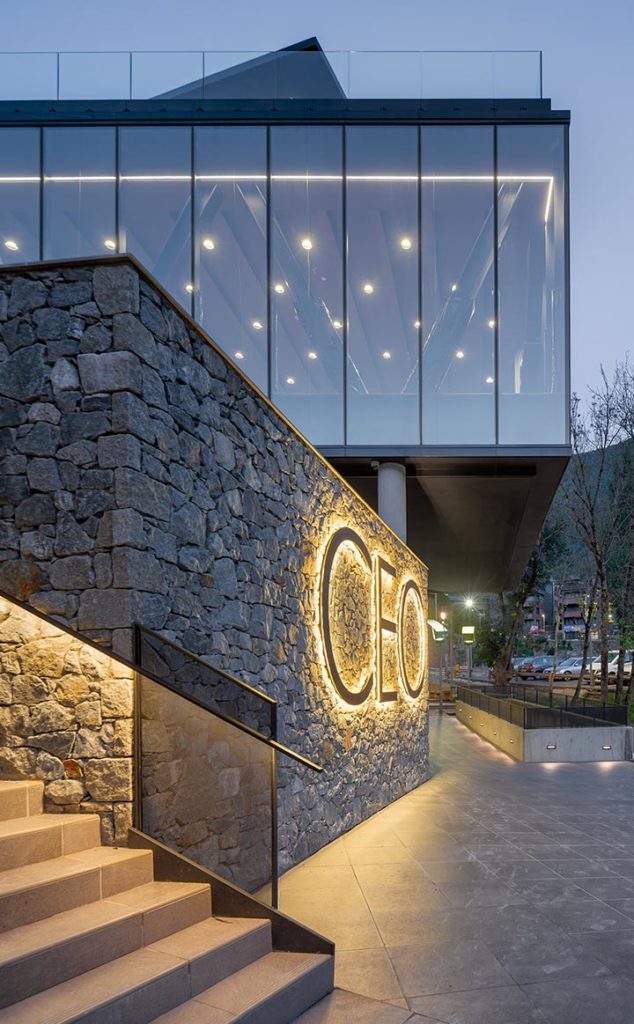 Ejecución: Estructura metálica con pilares en diagonal, muro cortina, revestimientos de panel composite, carpintería metálica y barandilla con perfil en U.