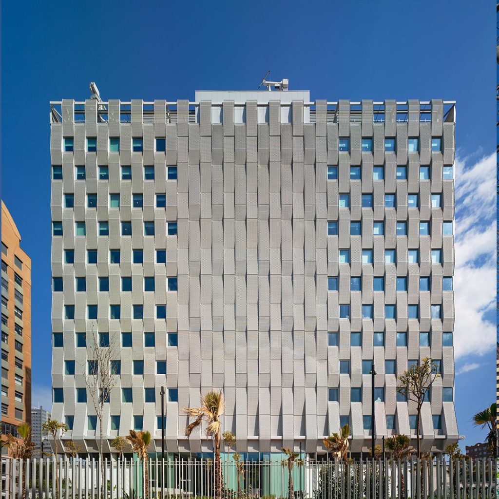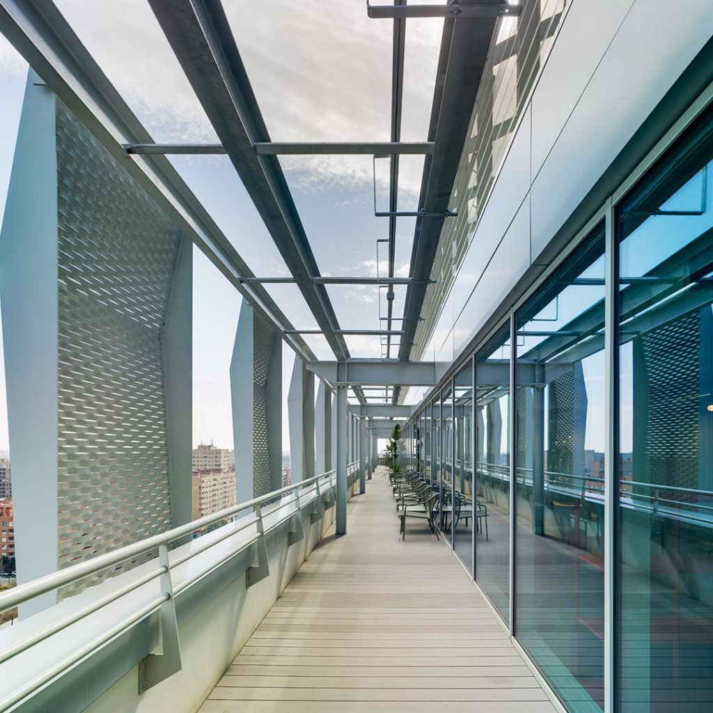 Ejecución: Fabricación y colocación de fachada de doble piel con deployé perforado y muro cortina